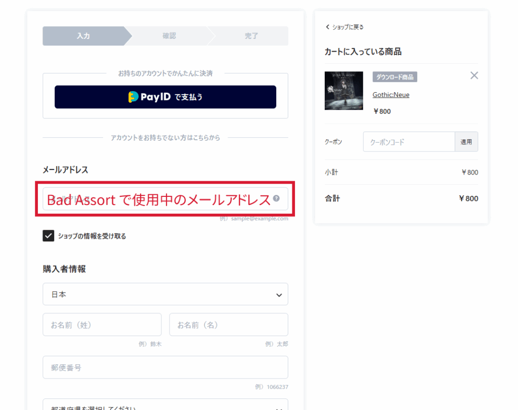 • 購入時に使用するメールアドレスは、必ずBad Assortにご登録いただいたメールアドレスと同一のものをご使用ください。アクティベーションキーは購入時に使用したメールアドレスに紐づいていますので、異なるメールアドレスのアクティベーションキーは使用できません。誤って購入した際はお問い合わせフォームよりご連絡ください。