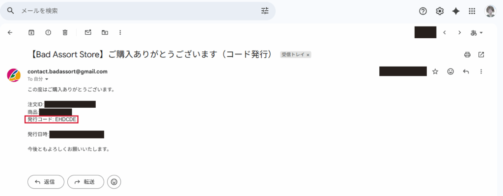 • メールは通常5分以内に配信されます。少々時間がかかる場合がありますので、重ねて購入されないようお願いします。