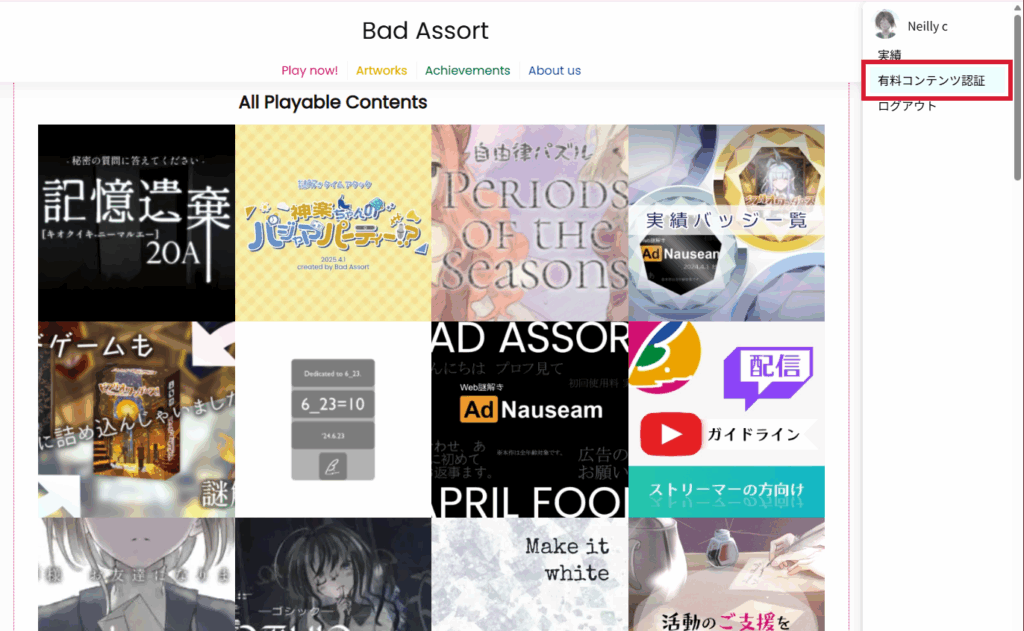 ③ Bad Assortにログイン後、画面右上のアイコンから「有料コンテンツ認証」を選択します。