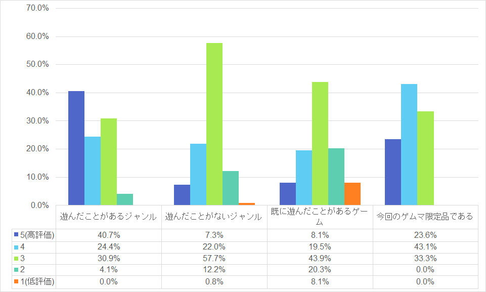 知っているジャンルのゲームの嗜好が強い、という結果になりました。一方で知らないジャンルのゲームであるということはどちらにも働きづらいようです。王道は強し。