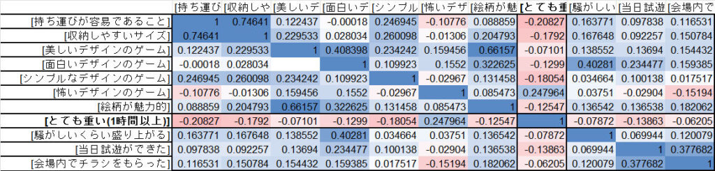 ただ、軽量級ゲーム好きと重量級ゲーム好きはもちろん相反する要素のはず。そこでちょっと手間をかけてそれぞれの項目の相関について分析してみました。