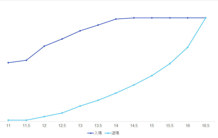 退場時刻が気になるところで、15時~16時に予約キャンセル分の開放などが集中するためかこの時間まで残っていた方は結構いるようです。さすがに16時を過ぎると人もだいぶ減っていますが、それでもこれだけの割合の人が最後までゲムマを楽しんでいたということで、かなり盛り上がっていた回だったと思います。