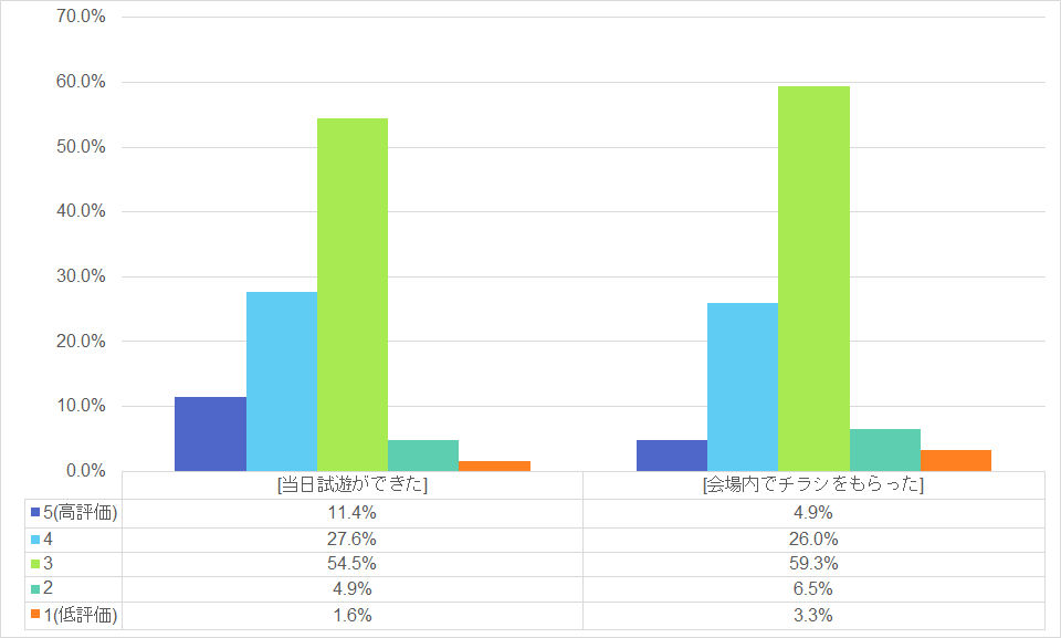 試遊は4割弱、チラシは3割ぐらいの方がある程度プラスの判断材料にするようです。試遊は人的リソースを割きますし、チラシをするのもタダではないので、宣伝効果の評価に困ったら参考にしてください。
