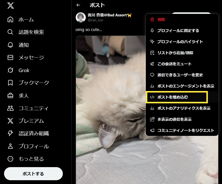 ポストの個別ページをWeb版で開き、右上のポップアップメニューから「ポストを埋め込む」を選択します。